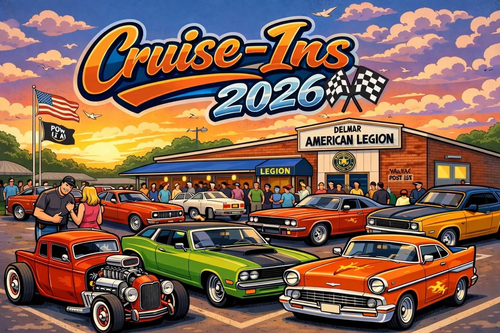 The Sons of the American Legion presents a monthly Cruise-In series for classic cars, hotrods, modern muscle...whatever you like to roll in. We have a nice big, paved parking lot, and will have burgers, hotdogs, and beverages available. Open to the public.